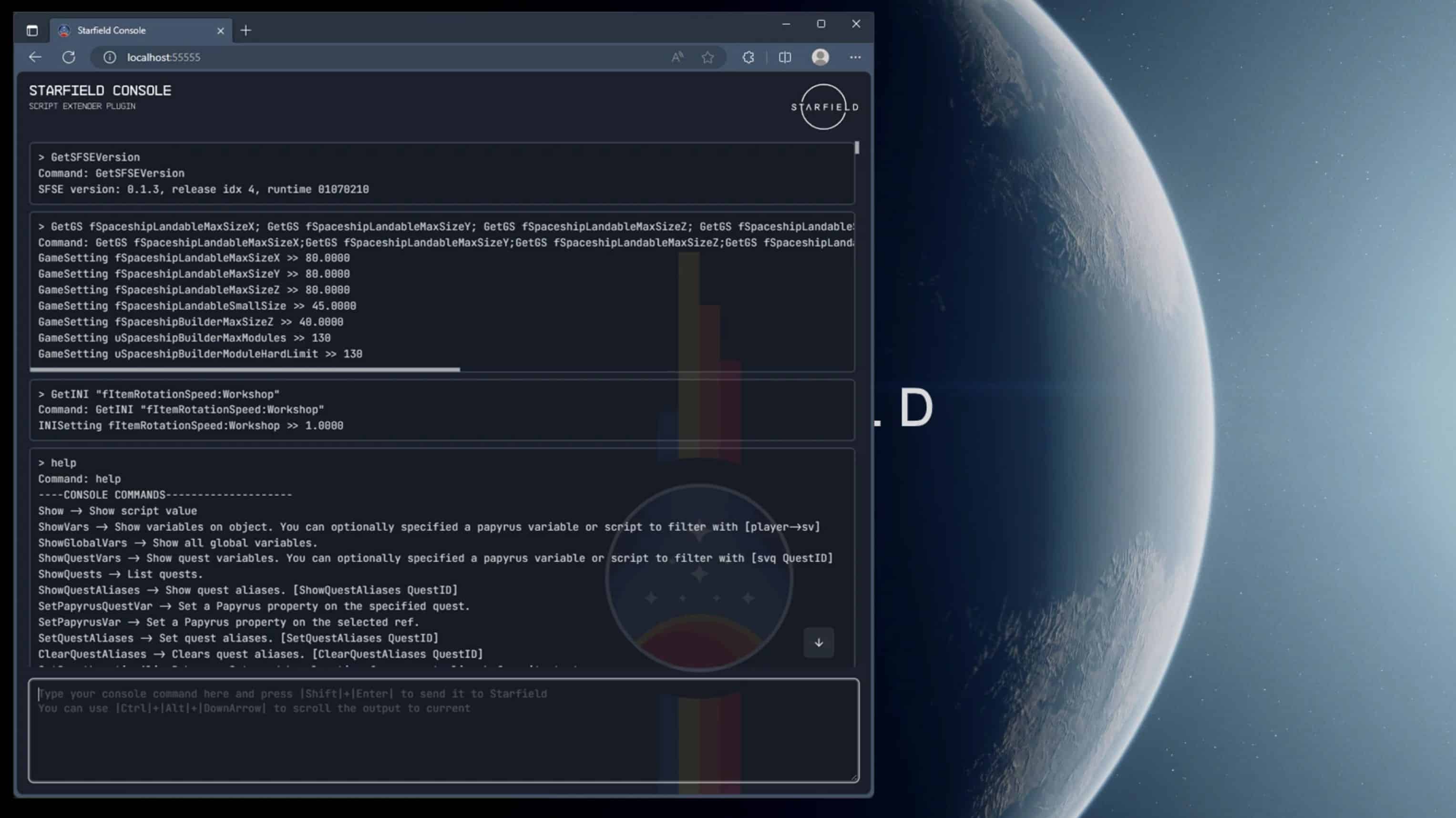 %USERPROFILE%\Documents\My Games\Starfield\SFSE\Logs\sfse_plugin_console_api.log