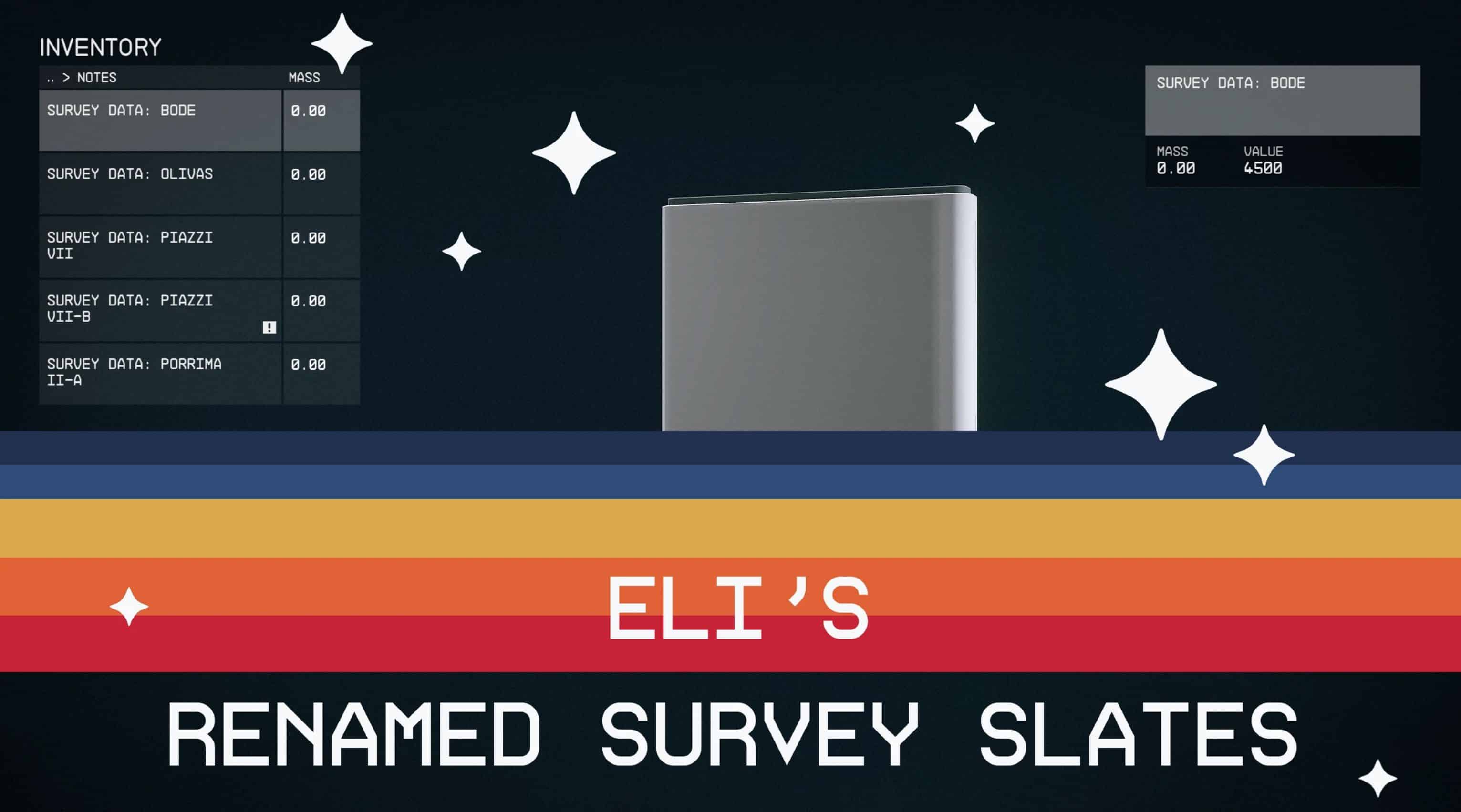 Renames the survey data slates from Survey Data to Survey Data: for less inventory chaos! I don’t believe I am the only one who was bothered by the chaos in my notes menu from all the different survey slates? This is a simple mod that renames all of the planet survey data slates. The unorganised slates in my inventory were driving me mad.