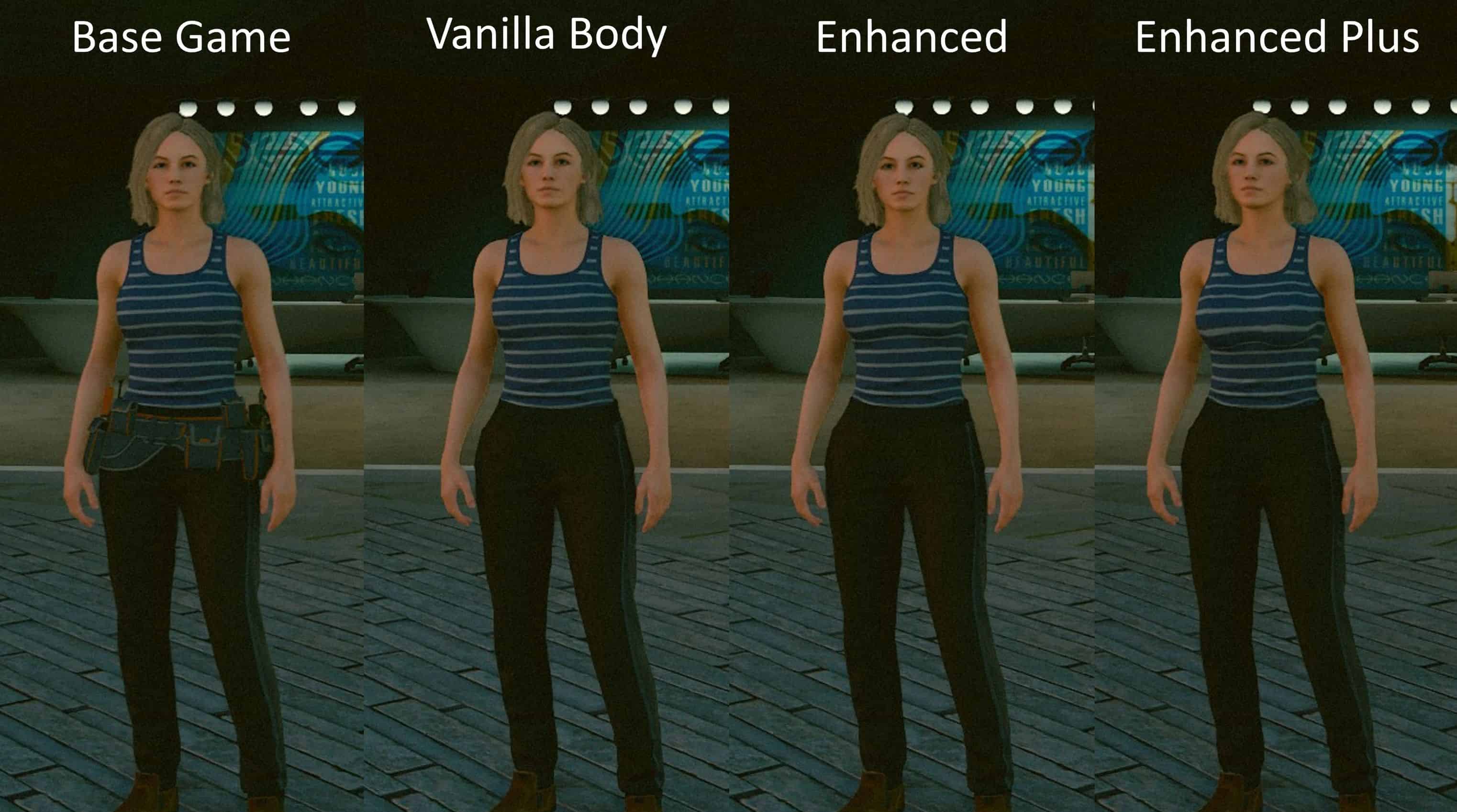 This mod hides Vladimir Sall’s tool belt and enhances the utility of the tank top as an apparel mash-up asset. This mod will only affect the female version of the outfit and is available in three body types.