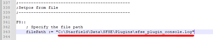 You need to change the filepath to yours If you have steam it will be for example: “C:/ProgramFiles/Steam/steamapps/common/Starfield/Data/SFSE/Plugins/sfse_plugin_console.log”