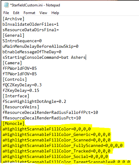 2. Copy all lines from the downloaded .ini and paste into StarfieldCustom.ini. Here is an example of what it may look like: