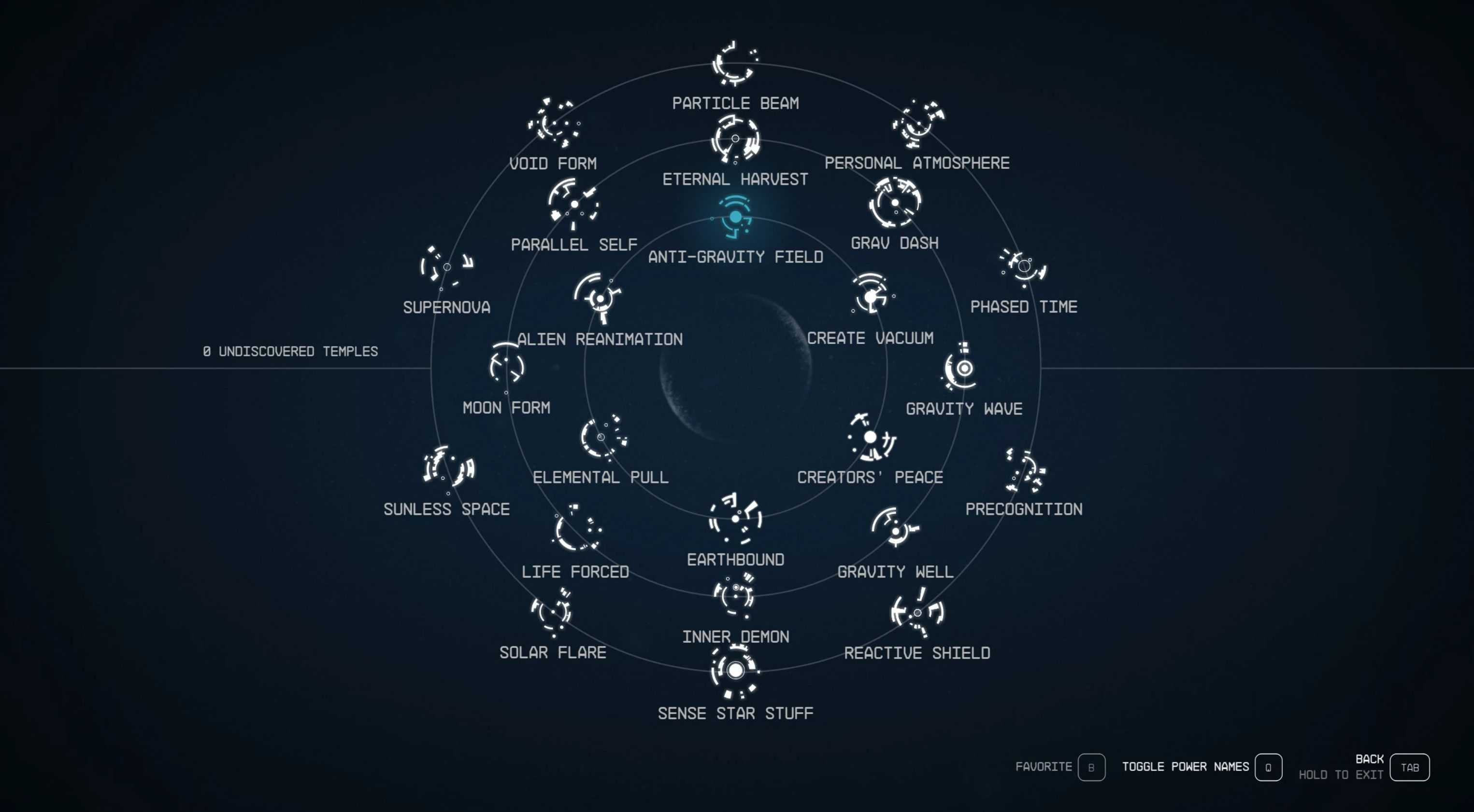 Shows unlocked power names by default when going to the powers menu. The power names are hidden when going back to the menu even if you have pressed the button to toggle them on.